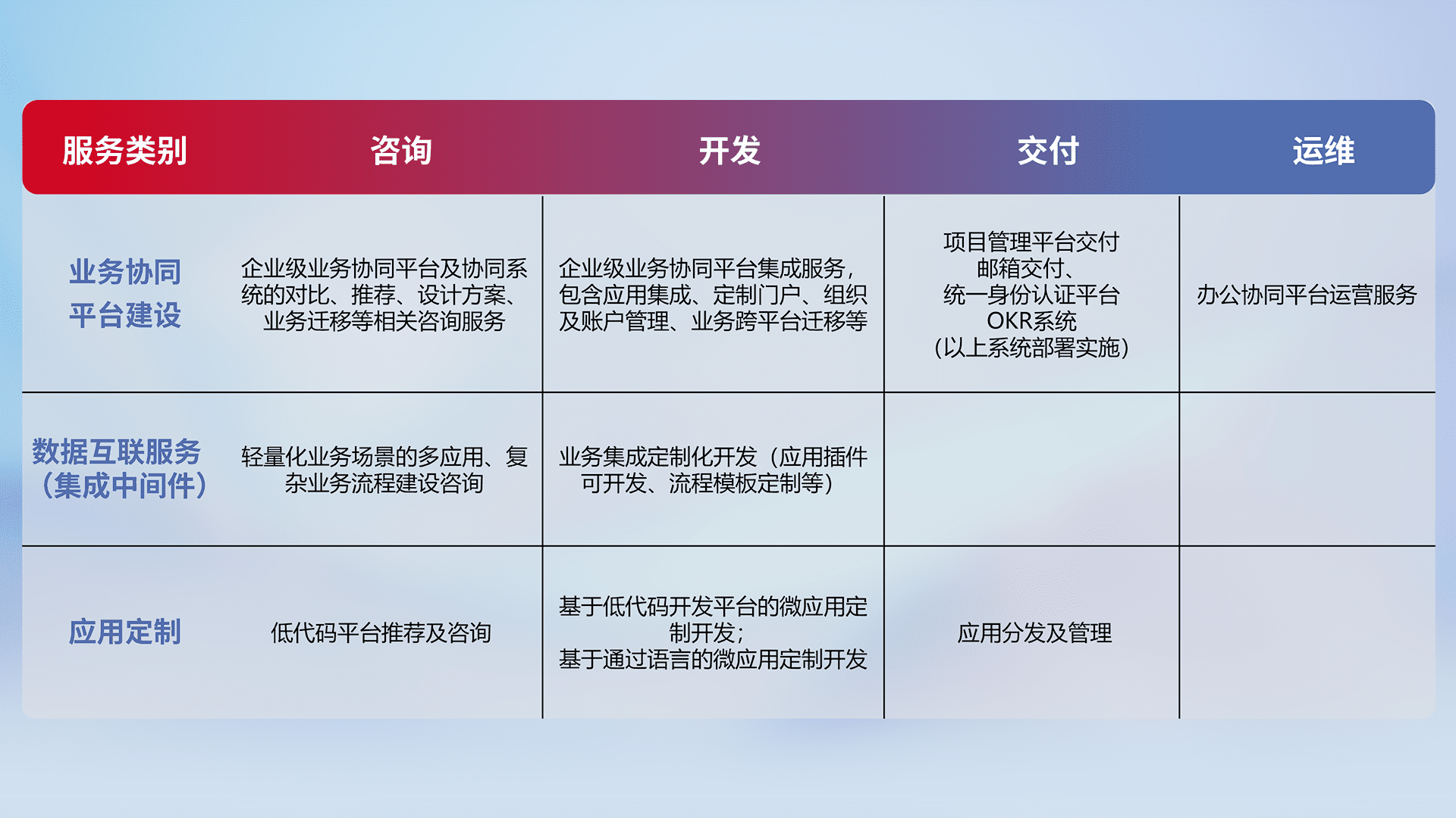 针对钉钉、、、企微、、、IDaas等平台级产品提供产品的规划、、、方案、、交付、、、定制化开发等服务,,实现如统一协同办公、、智能客户服务、、、、混合会议管理、、、、智能数据查询、、、等业务场景,,,,实现数字化转型。。。。