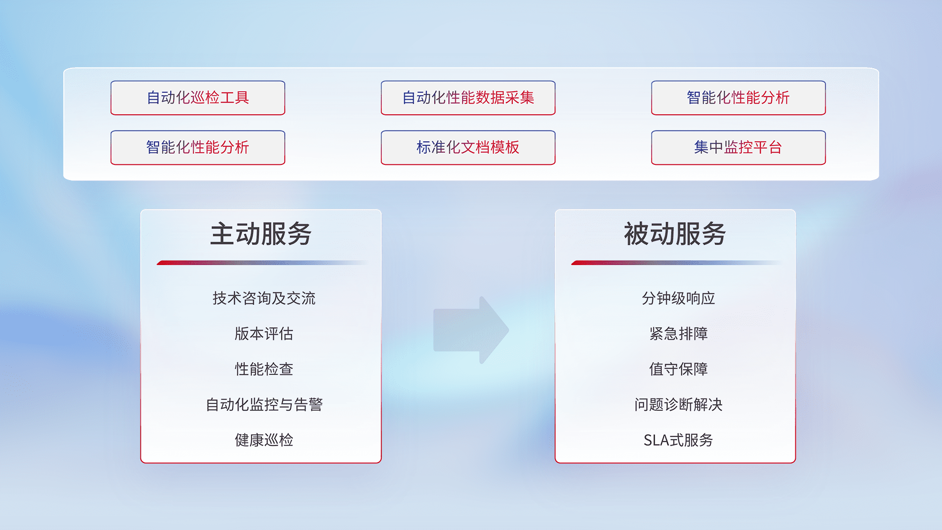 智能化工具和标准化文档,,,,保障服务质量,,,提供主动服务(包含技术咨询、、版本评估、、、、性能检查、、、自动化监控与告警、、、、健康巡检)和被动服务包含(分钟级响应、、紧急排障、、、值守保障、、问题诊断解决、、、、SLA服务)。。。。